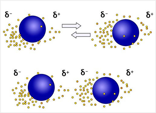 En outre, l’électronégativité (4) est la grandeur relative qui traduit l’aptitude d’un atome A à attirer dans sa direction le doublet d’électrons qui l’associe à un atome B dans une liaison covalente. Ainsi, plus l’électronégativité d’un atome est élevée, plus celui-ci attire les électrons. De plus, une liaison entre deux atomes A et B est polarisée (20) si ces deux atomes ont une électronégativité différente . Plus la différence d’électronégativité entre ces deux atomes est importante, plus la liaison est polarisée. Les forces de Van der Walls sont de nature électrostatique. Elles sont responsables des liaisons intermoléculaires de faible intensité.
